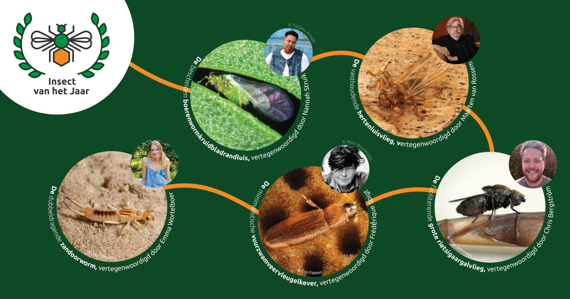 De vijf kandidaten zijn misschien onbekend, en daardoor onbemind, maar ze hebben wel allemaal een goed verhaal. Zelf kunnen ze dat echter niet vertellen, dus wordt elk insect vertegenwoordigd door een bekende Nederlander. Klik op de naam of de foto voor meer informatie!