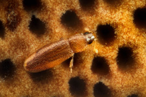 Vuurzwamveervleugelkever – Baranowskiella ehnstromi – bijgestaan door veelzijdig kunstenaar Frédérique Spigt.
