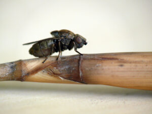 Grote rietsigaargalvlieg – Lipara lucens – met podcastmaker Chris Bergström als ambassadeur.